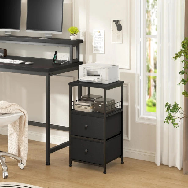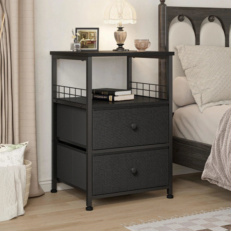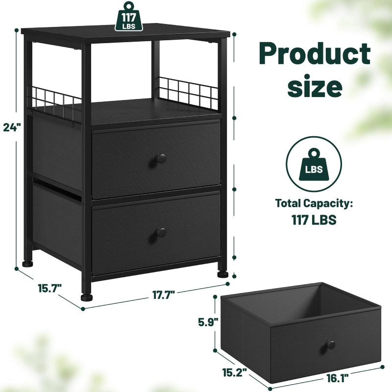 This 24-inch tall bedside table (17.7" W x 15.7" D) combines 2 fabric drawers, a spacious worktop, and open shelving to neatly organize books, devices, décor, and essentials. Its compact yet functional design maximizes small spaces while adding farmhouse elegance.
