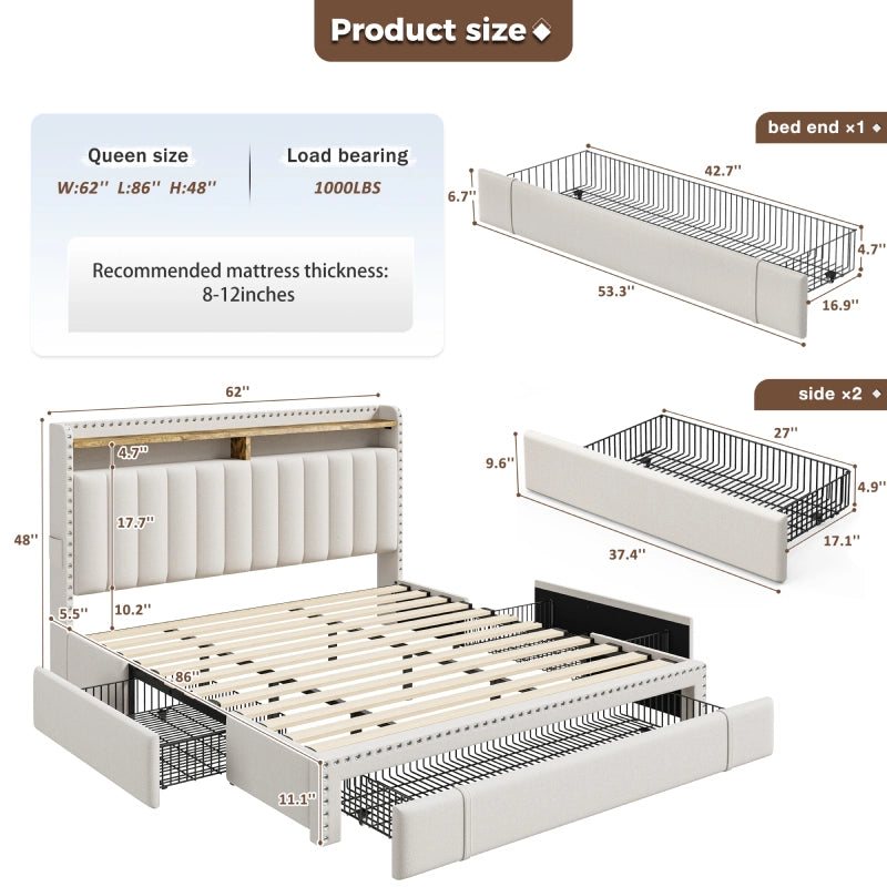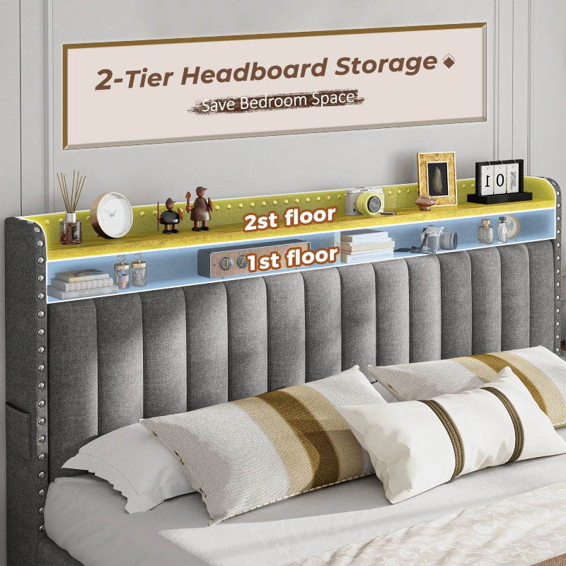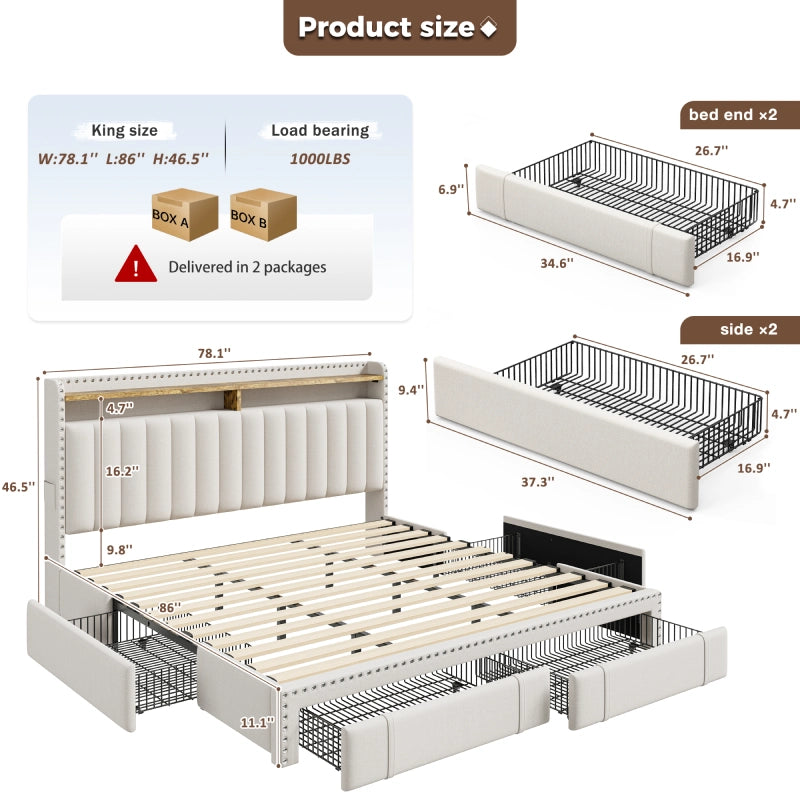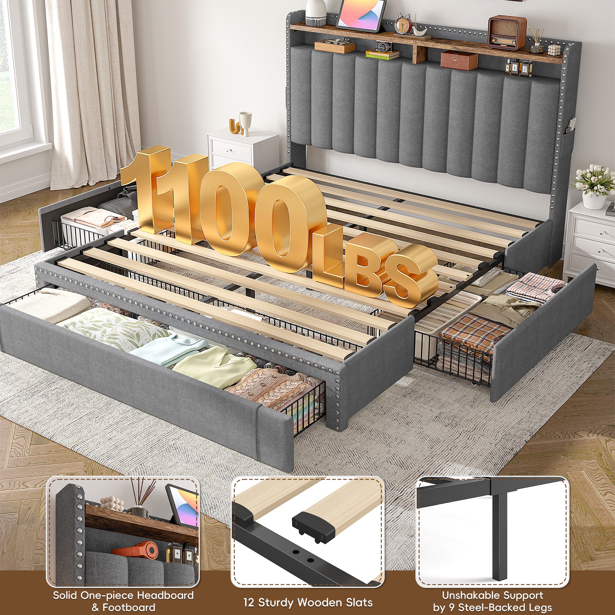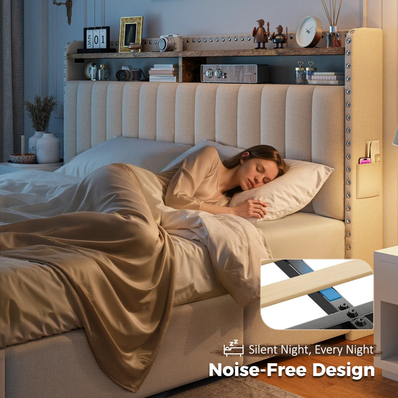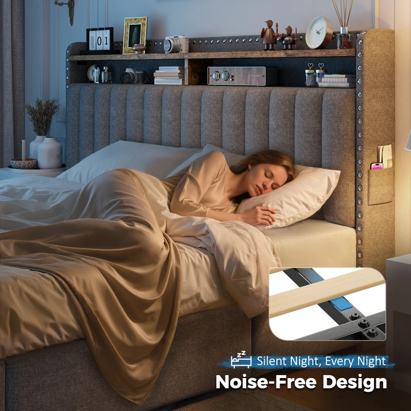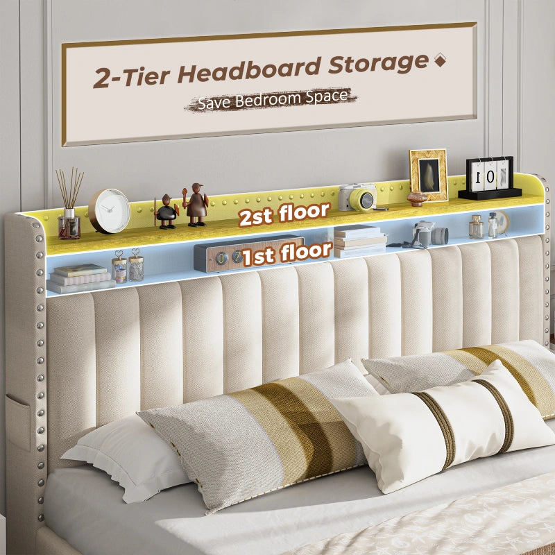 This bed frame features two built-in layers of storage — giving you extra room to keep daily essentials neatly organized. From bedtime reads and décor to storage baskets or folded clothes, everything stays right where you need it.