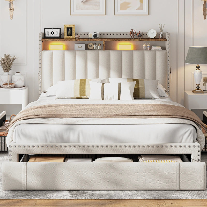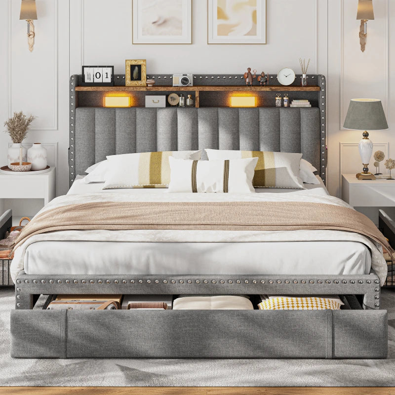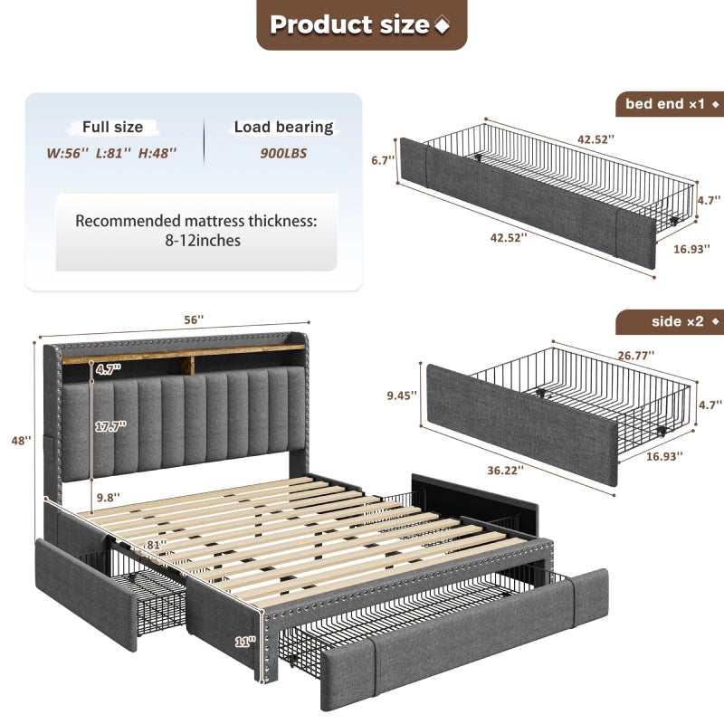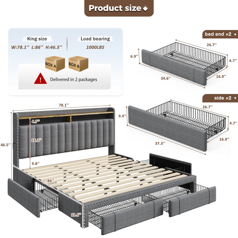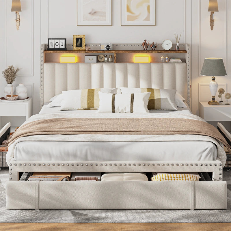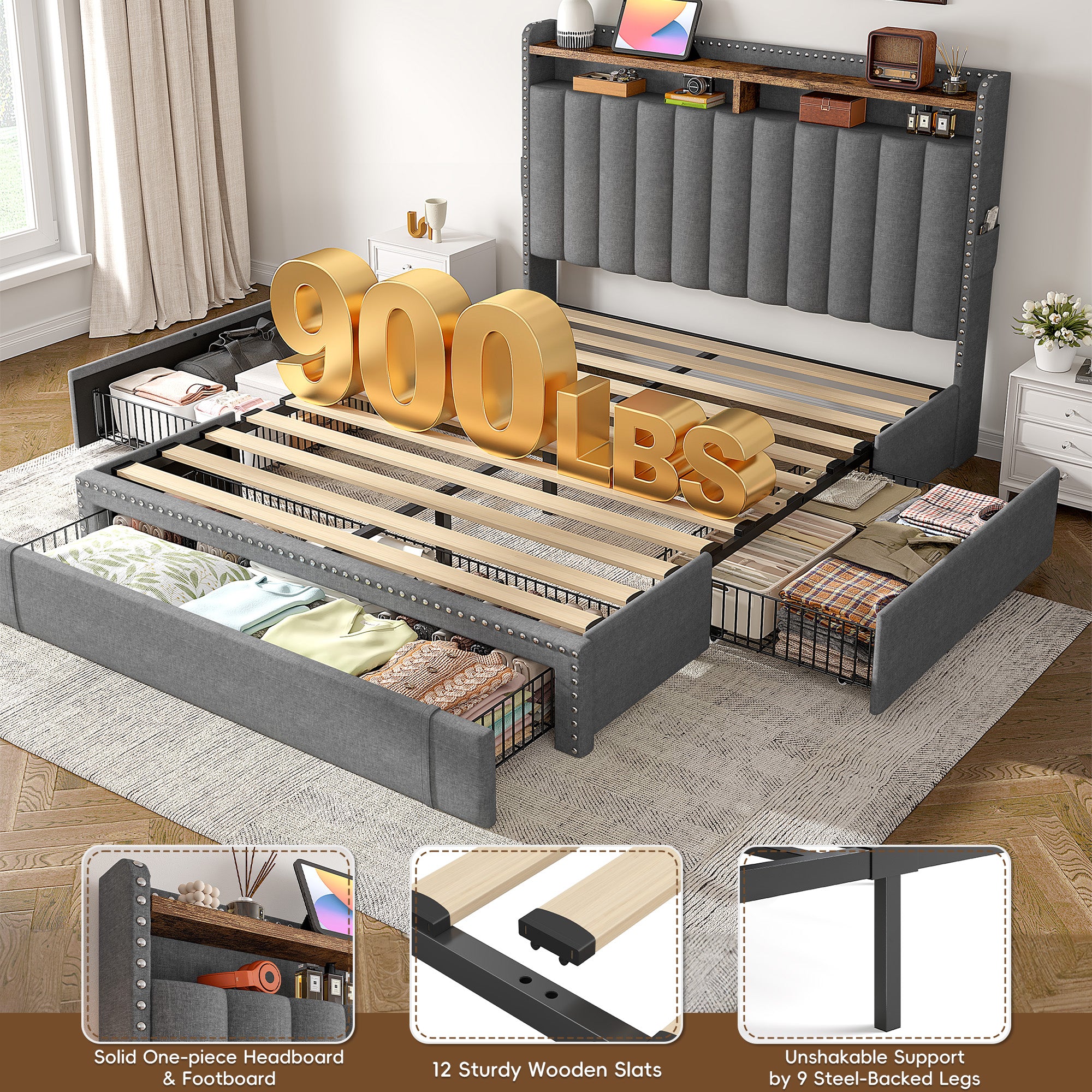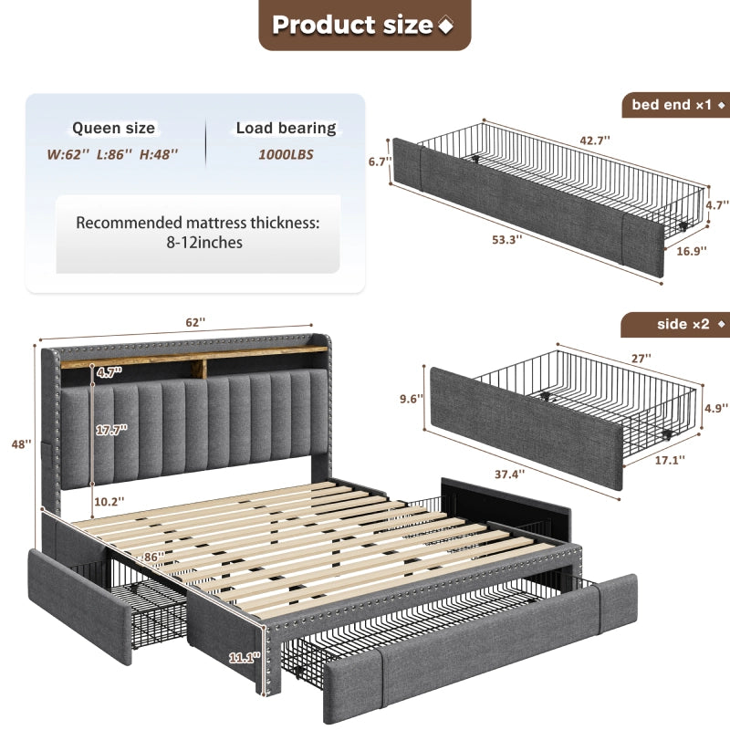 This bed frame features two built-in layers of storage — giving you extra room to keep daily essentials neatly organized. From bedtime reads and décor to storage baskets or folded clothes, everything stays right where you need it.