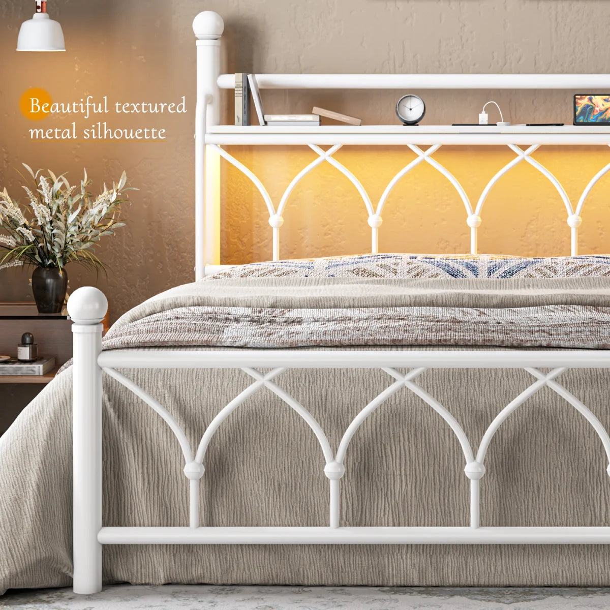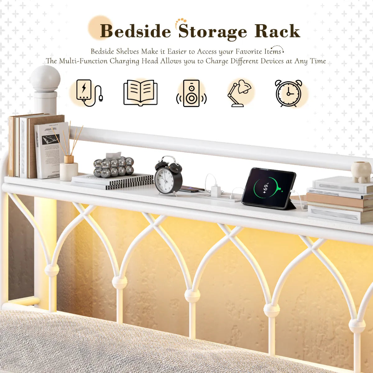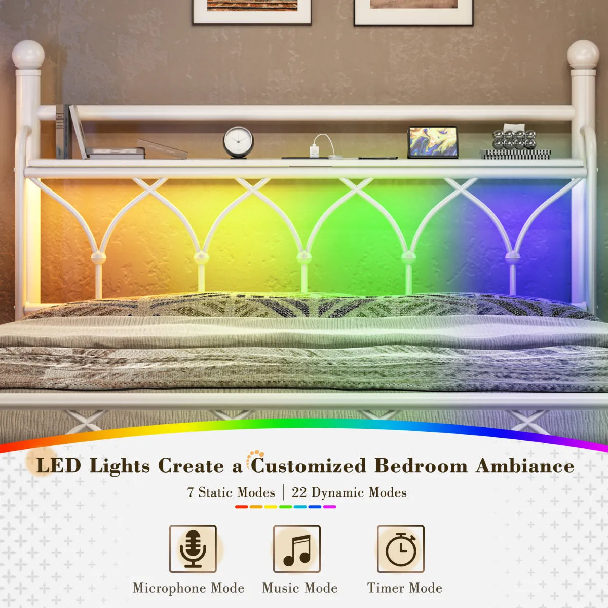 This bed’s headboard combines RGB LED lights and practical storage. With 22 dynamic and 7 static lighting modes controlled by remote, you can set the right ambiance for reading, gaming, or relaxing. The top shelf features built-in USB ports—keep your phone, glasses, and essentials within easy reach. No more messy nightstands—just a cleaner, more functional space that reflects your mood and lifestyle.