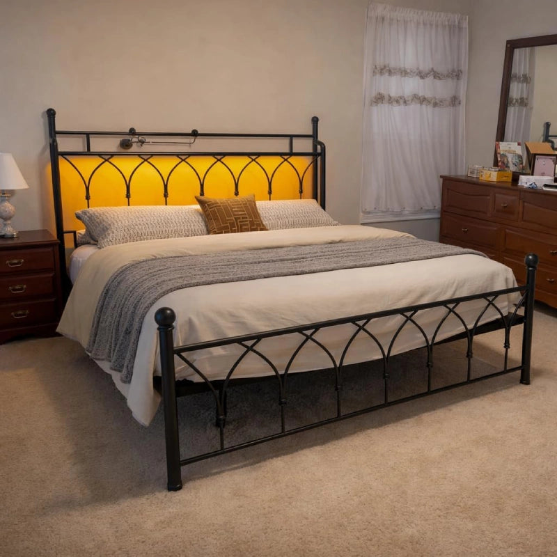 This bed’s headboard combines RGB LED lights and practical storage. With 22 dynamic and 7 static lighting modes controlled by remote, you can set the right ambiance for reading, gaming, or relaxing. The top shelf features built-in USB ports—keep your phone, glasses, and essentials within easy reach. No more messy nightstands—just a cleaner, more functional space that reflects your mood and lifestyle.