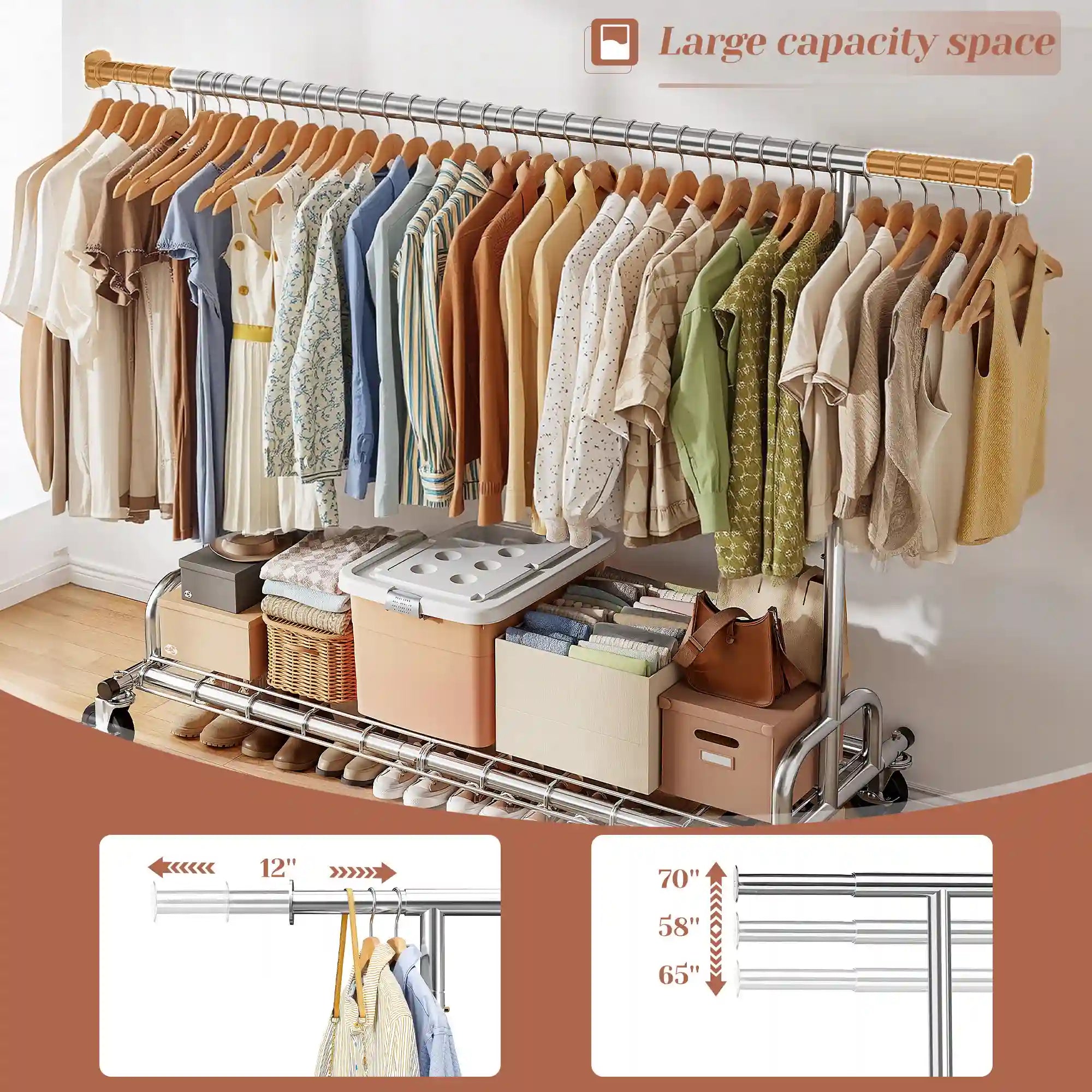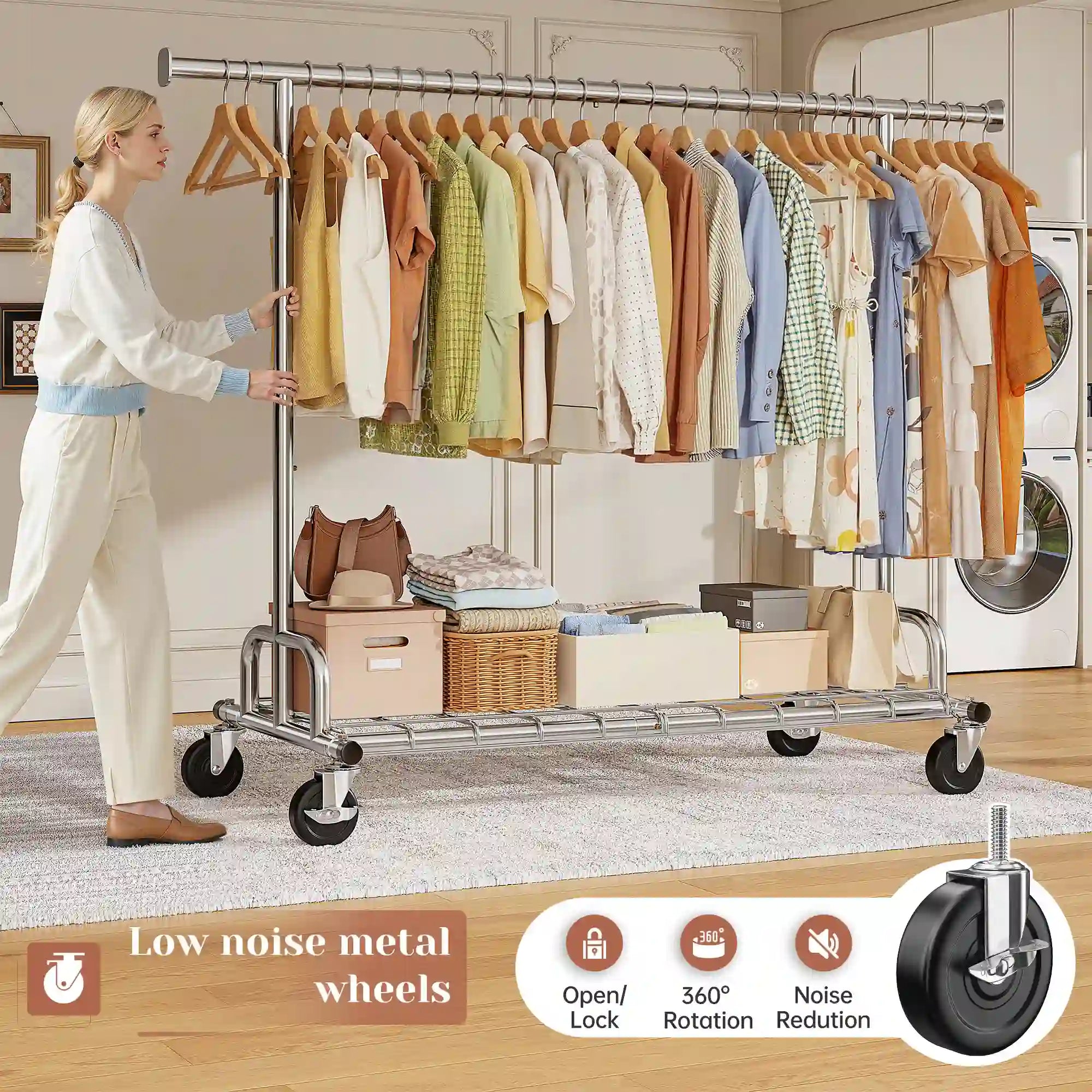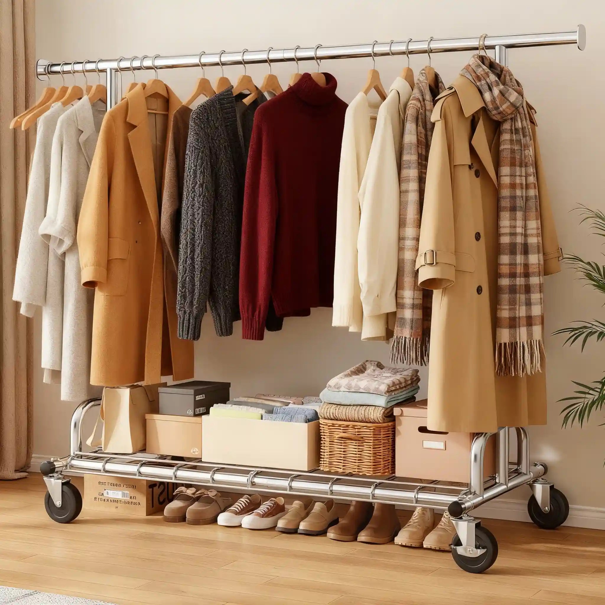 Say goodbye to cramped closets! This extra-wide rolling garment rack offers massive storage space for your entire wardrobe — from bulky coats and jackets to delicate dresses and everyday T-shirts. Perfect for dorms, apartments, laundry rooms, or as a portable closet anywhere you need it.