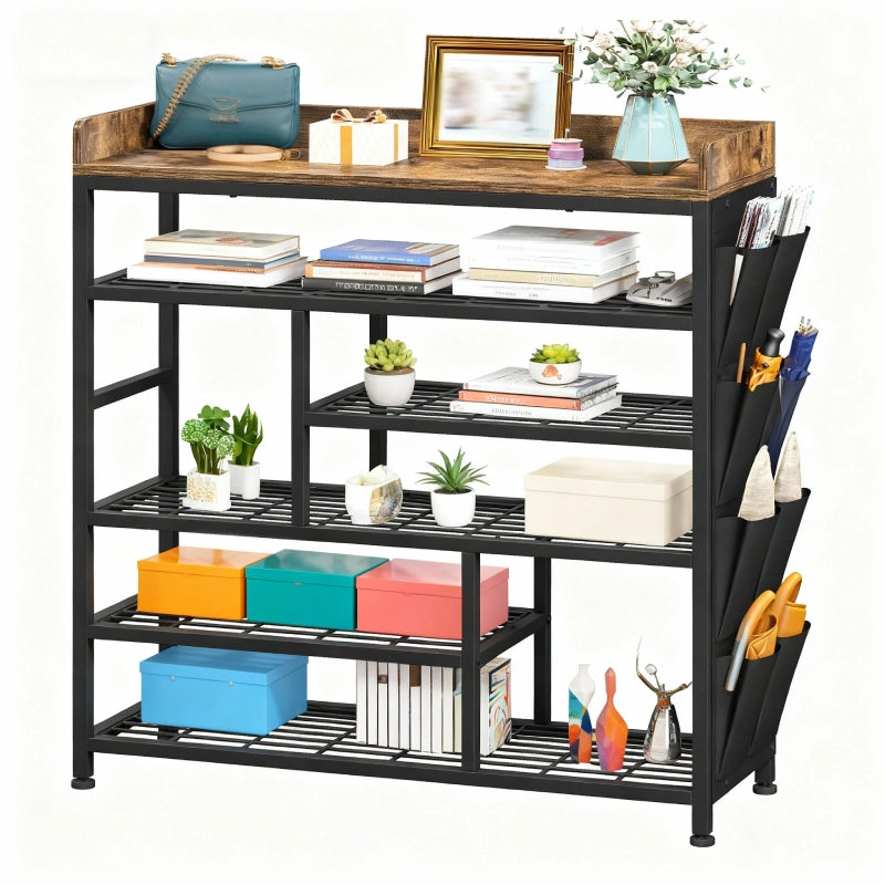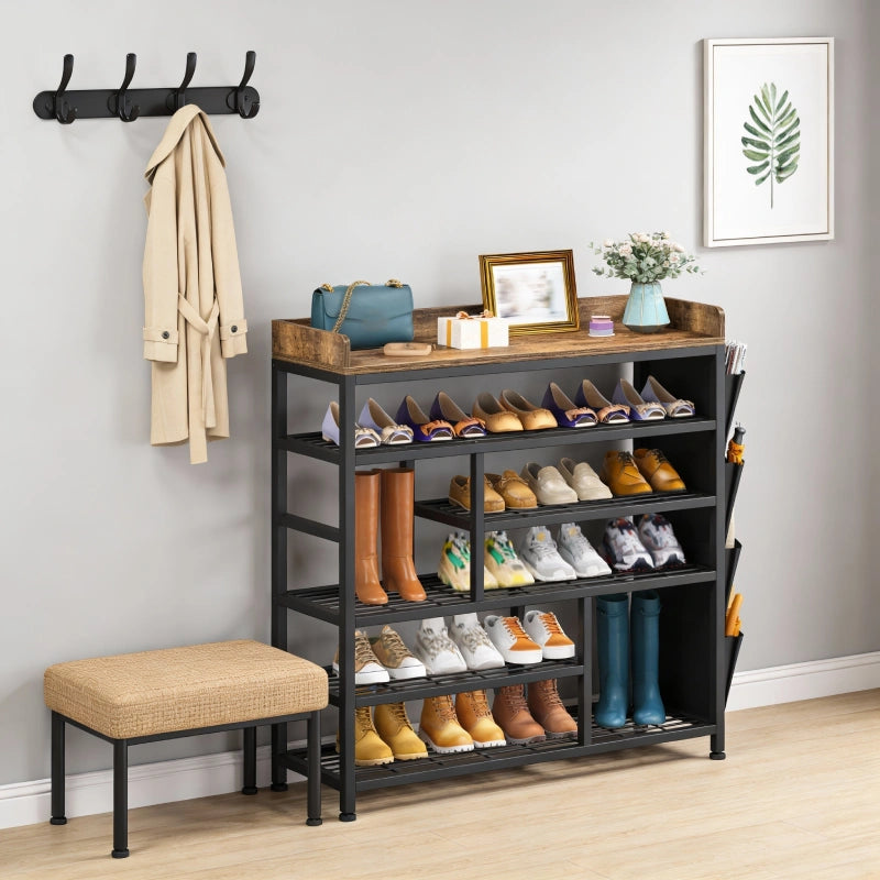 Space-Saving Entryway Shoe RackTired of shoes cluttering your hallway? This wooden shoe rack measures 39.4"W x 11.9"D x 41.4"H and features a sturdy metal frame that can accommodate up to 24 pairs of shoes. It’s a perfect solution for organizing footwear in compact spaces and keeping your entryway neat and tidy. Ideal for narrow entrances, hallways, foyers, closets, mudrooms, living rooms, bedrooms, apartments, and dorms.