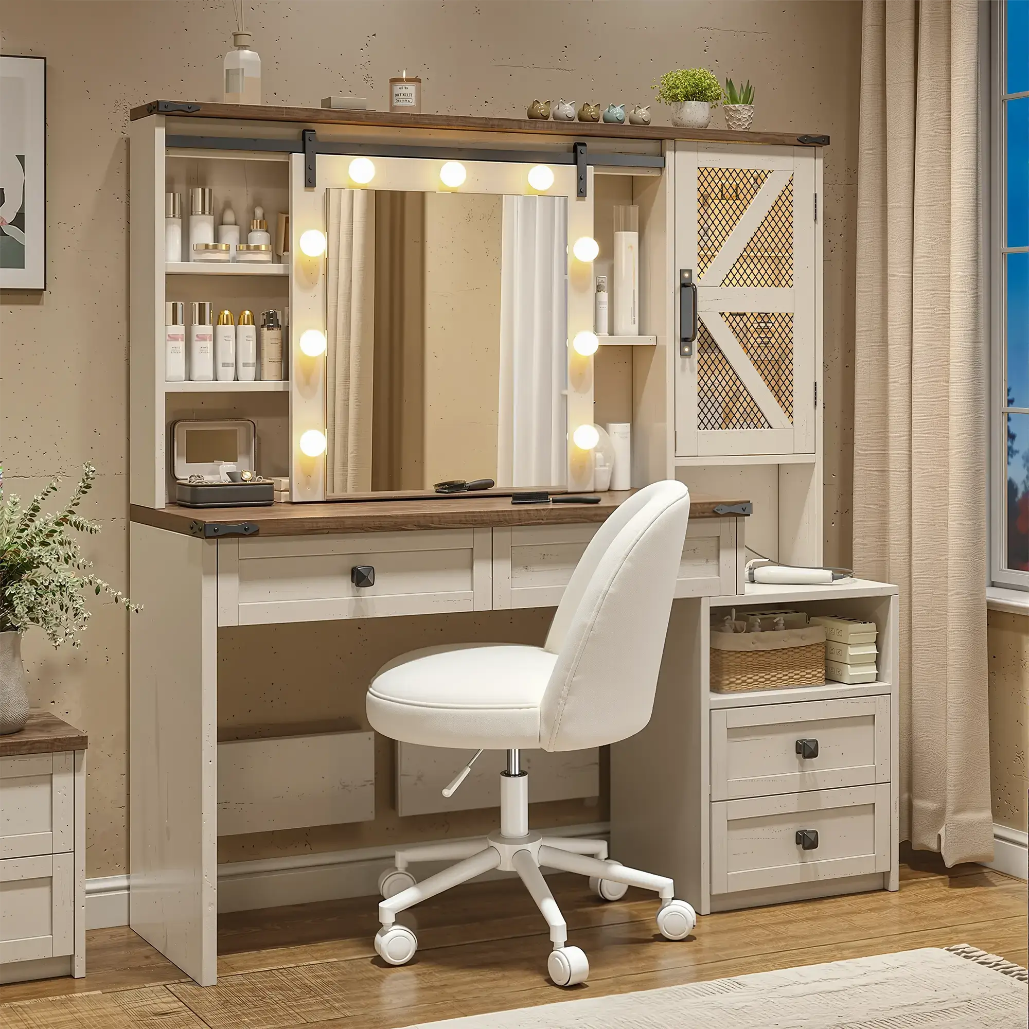 This vanity features 4 spacious drawers, 1 open storage compartment, a sliding mirror with three-tier and two-tier storage behind it, plus a barn-style cabinet. Makeup, jewelry, and hair tools all have their place—no more digging or rushing.