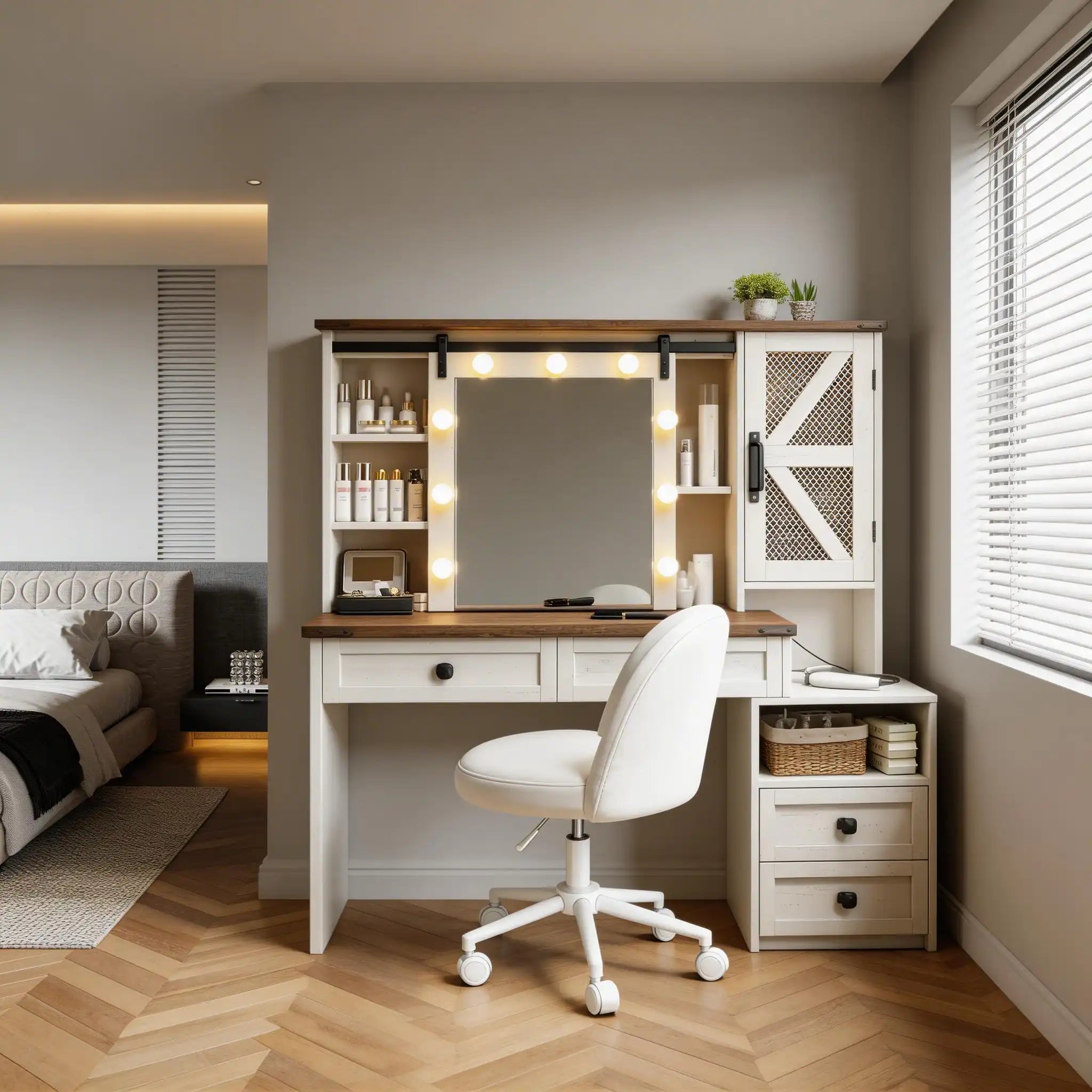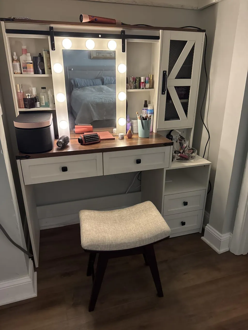 This vanity features 4 spacious drawers, 1 open storage compartment, a sliding mirror with three-tier and two-tier storage behind it, plus a barn-style cabinet. Makeup, jewelry, and hair tools all have their place—no more digging or rushing.
