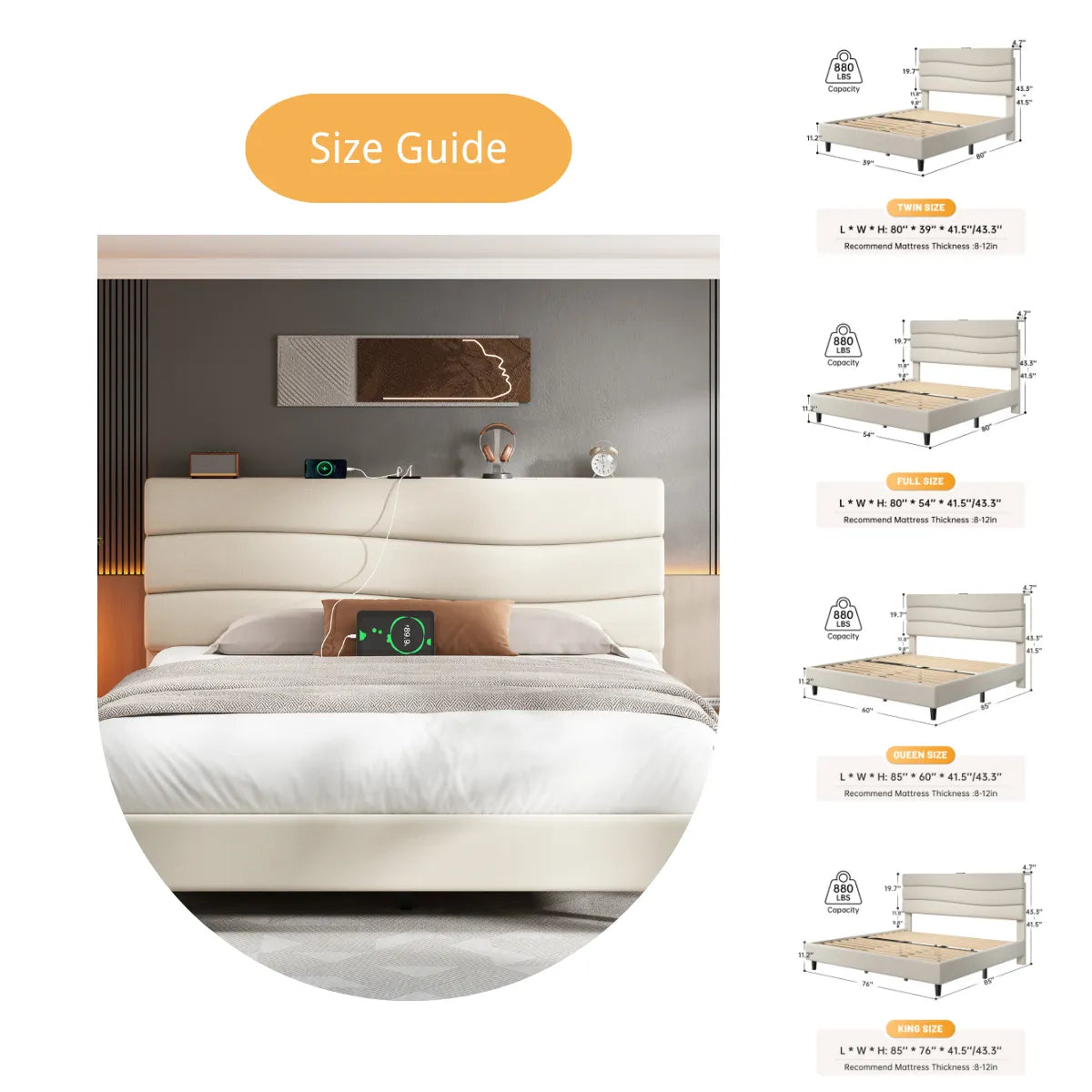 Available in four sizes, this bed frame fits various bedroom needs and comes in Beige and Gray to match different decor styles. The adjustable upholstered headboard (41.5"~43.3") suits mattresses 8"–12" thick for added comfort.