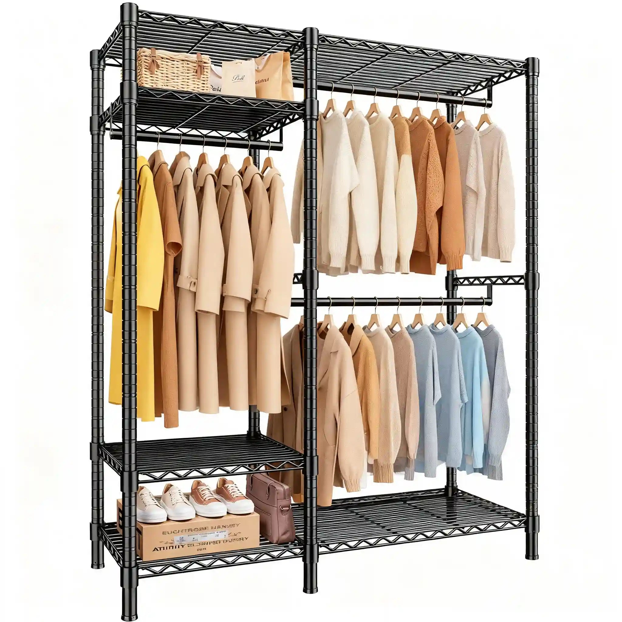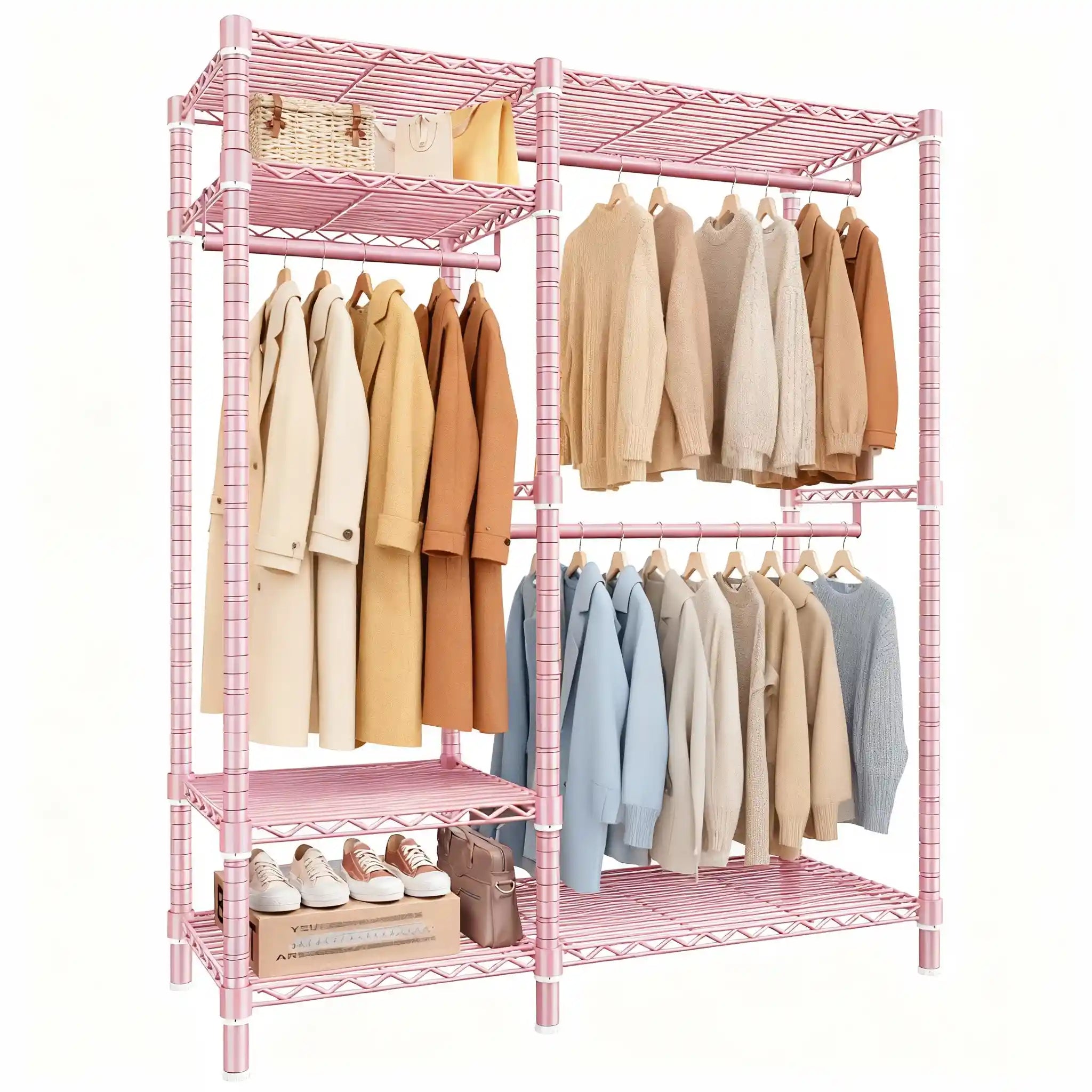 This heavy-duty clothes rack flexibly adapts to different home layouts, making it a smart choice for bedrooms, walk-in closets, laundry rooms, dorms, or apartments. Available in two styles, the wheel-free version (77"H x 45.5"W x 16.5"D) offers sturdy, long-term stability for fixed placement, while the wheeled version (79"H x 45.5"W x 16.5"D) allows effortless mobility and quick reconfiguration for dynamic spaces. With finish options in black or pink (wheel-free), it blends seamlessly into any décor while keeping your clothes and essentials neatly organized.