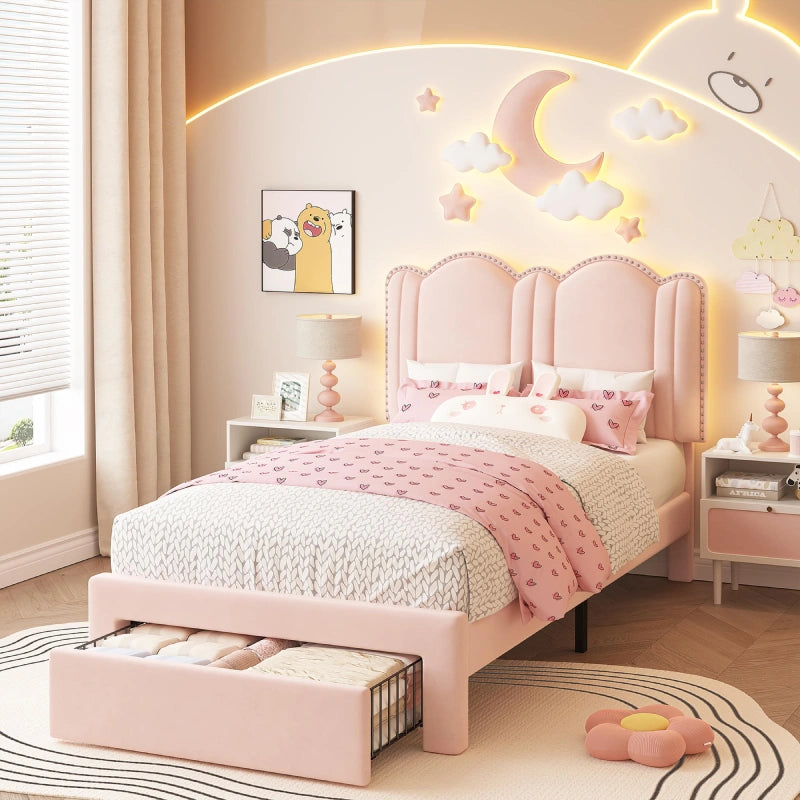 Upholstered in soft, skin-friendly velvet fabric, this twin bed frame blends elegance with comfort. The fabric subtly changes color under different lighting, adding a touch of sophistication to your child's room while ensuring a cozy sleep experience.