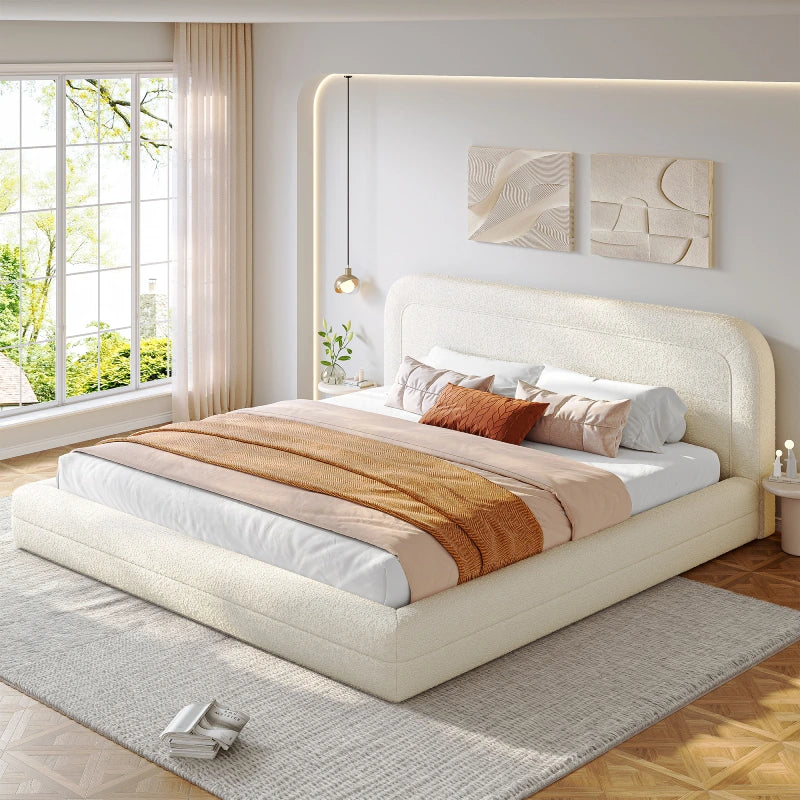 Featuring a smooth curved headboard and boucle-inspired velour fabric, the low bed frame blends softness with sophistication. Its modern minimalist profile complements apartments, guest rooms, and cozy contemporary spaces.
