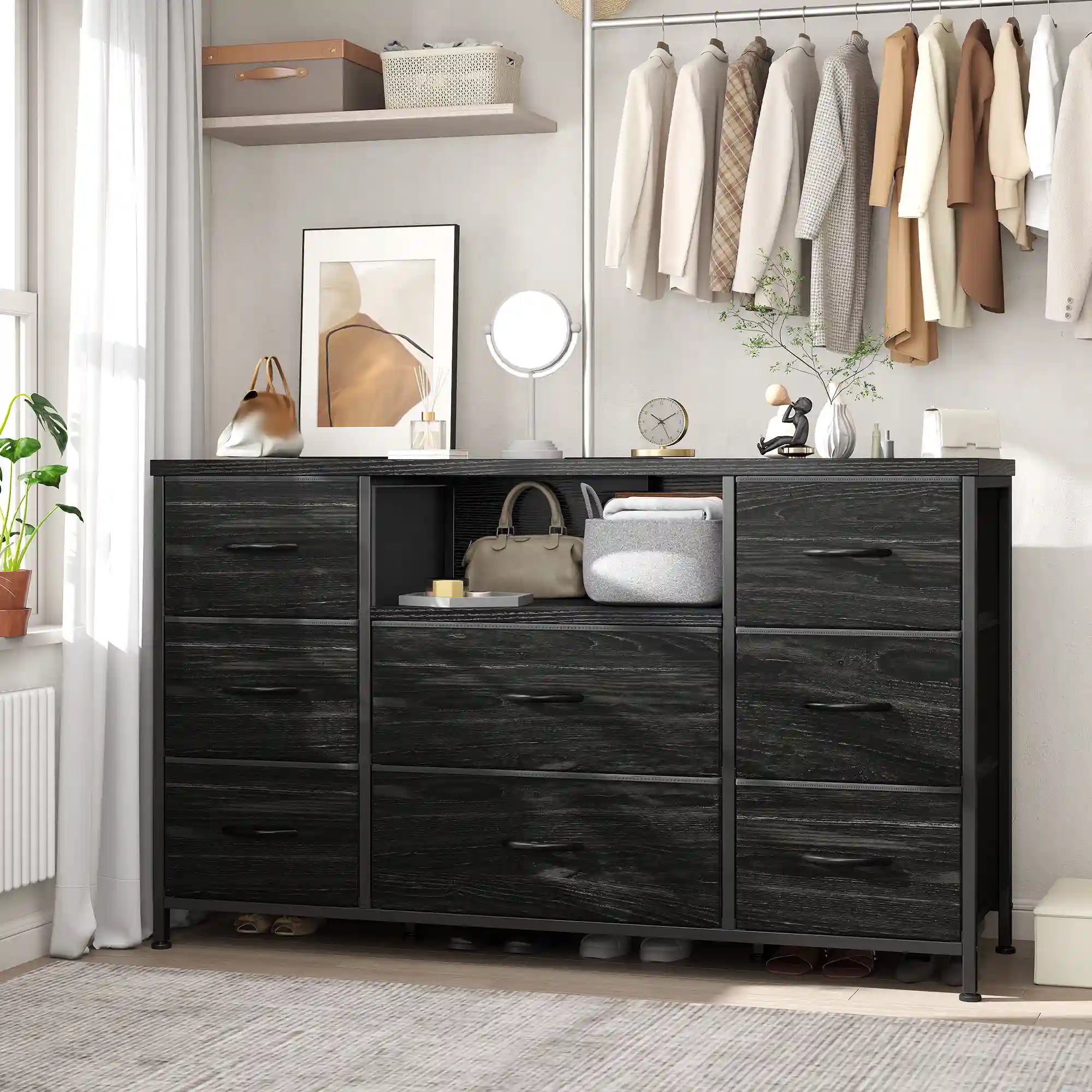 Sturdy and Durable Dresser: Strong steel frame and water-resistant wood top offer stable support and ensure years of use.